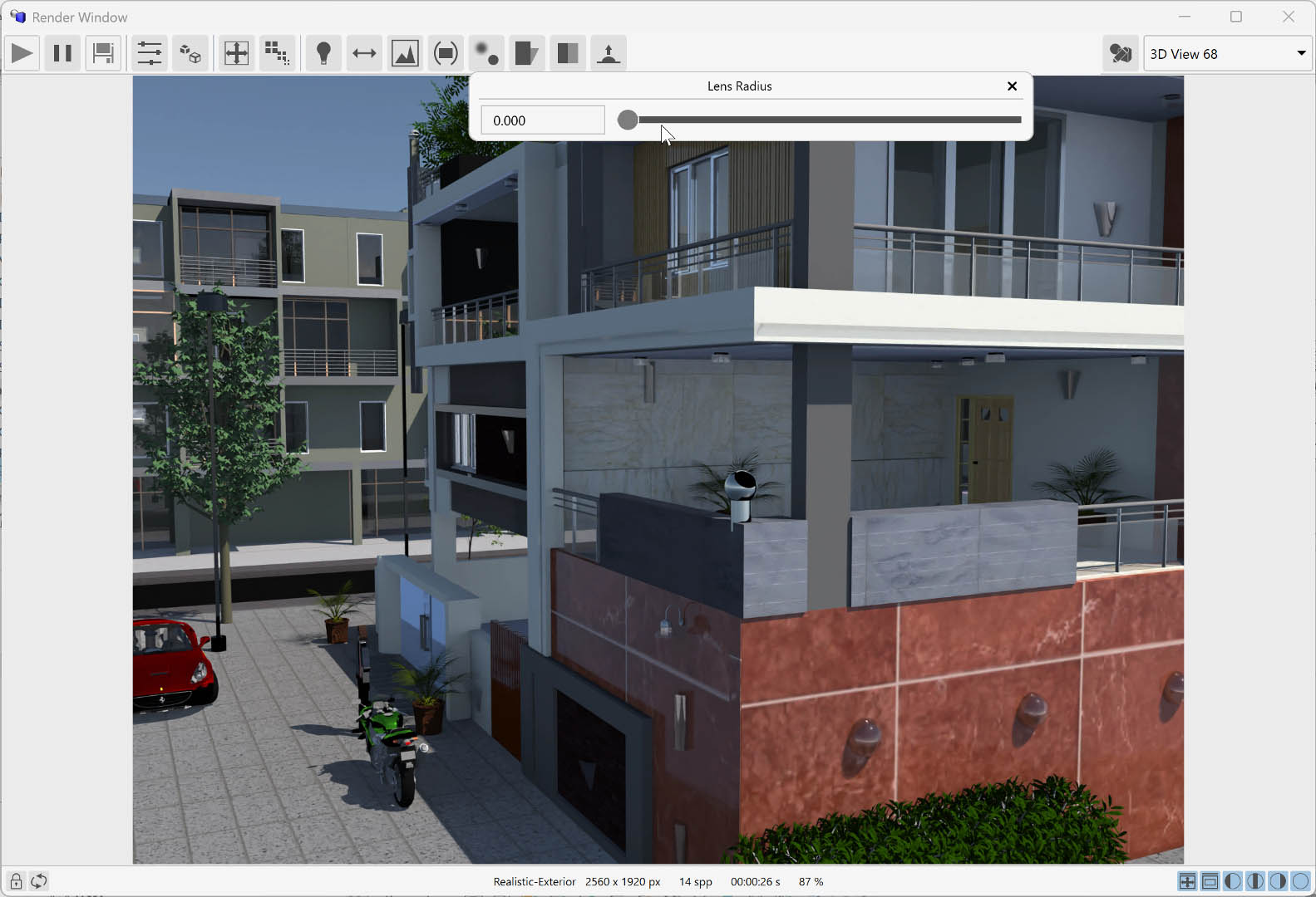 AmbientOcclusion includes a depth of field effect, controlled by two parameters: lens radius, which defines the strength of the blur (larger values increase the effect), and lens position, which sets the focus point in the scene.